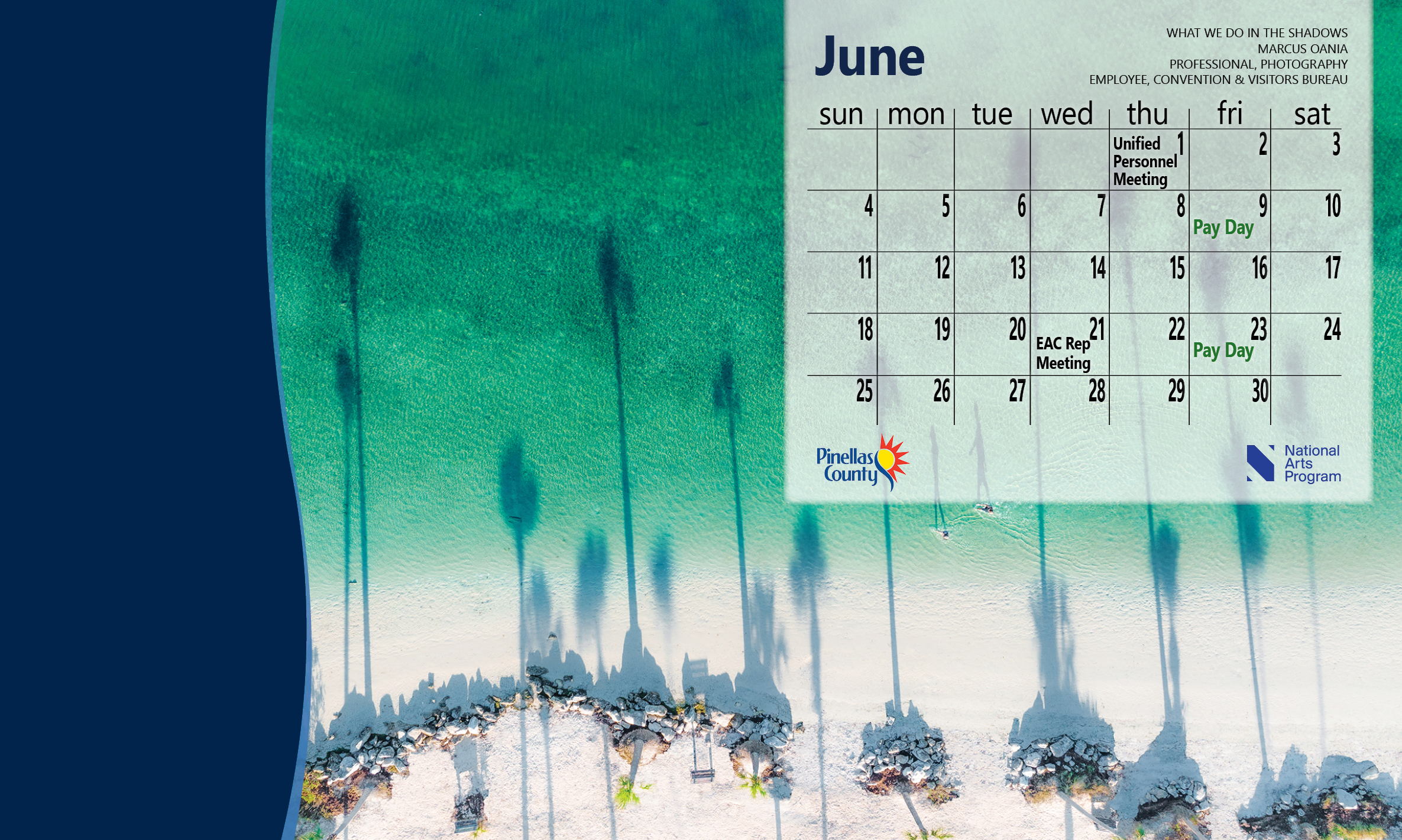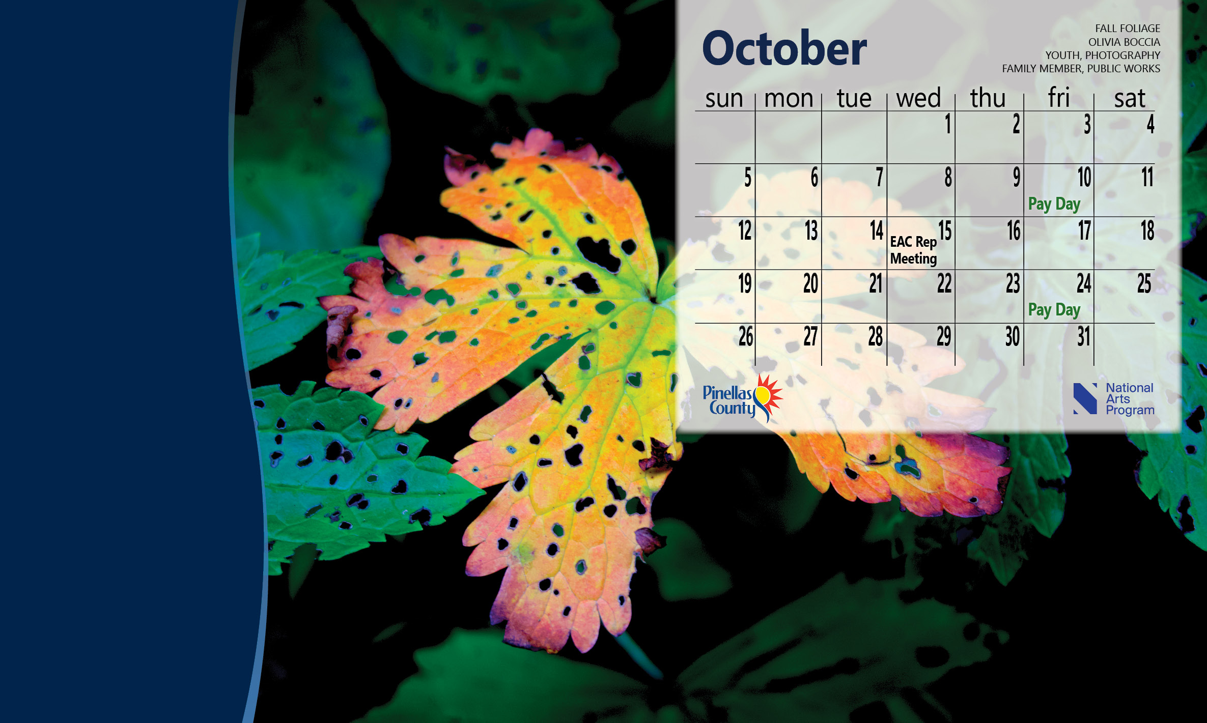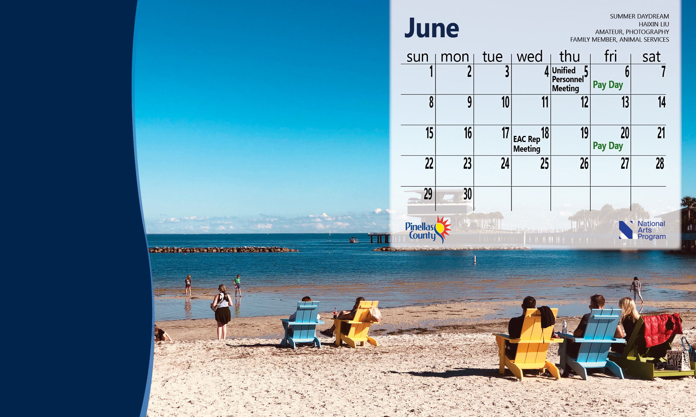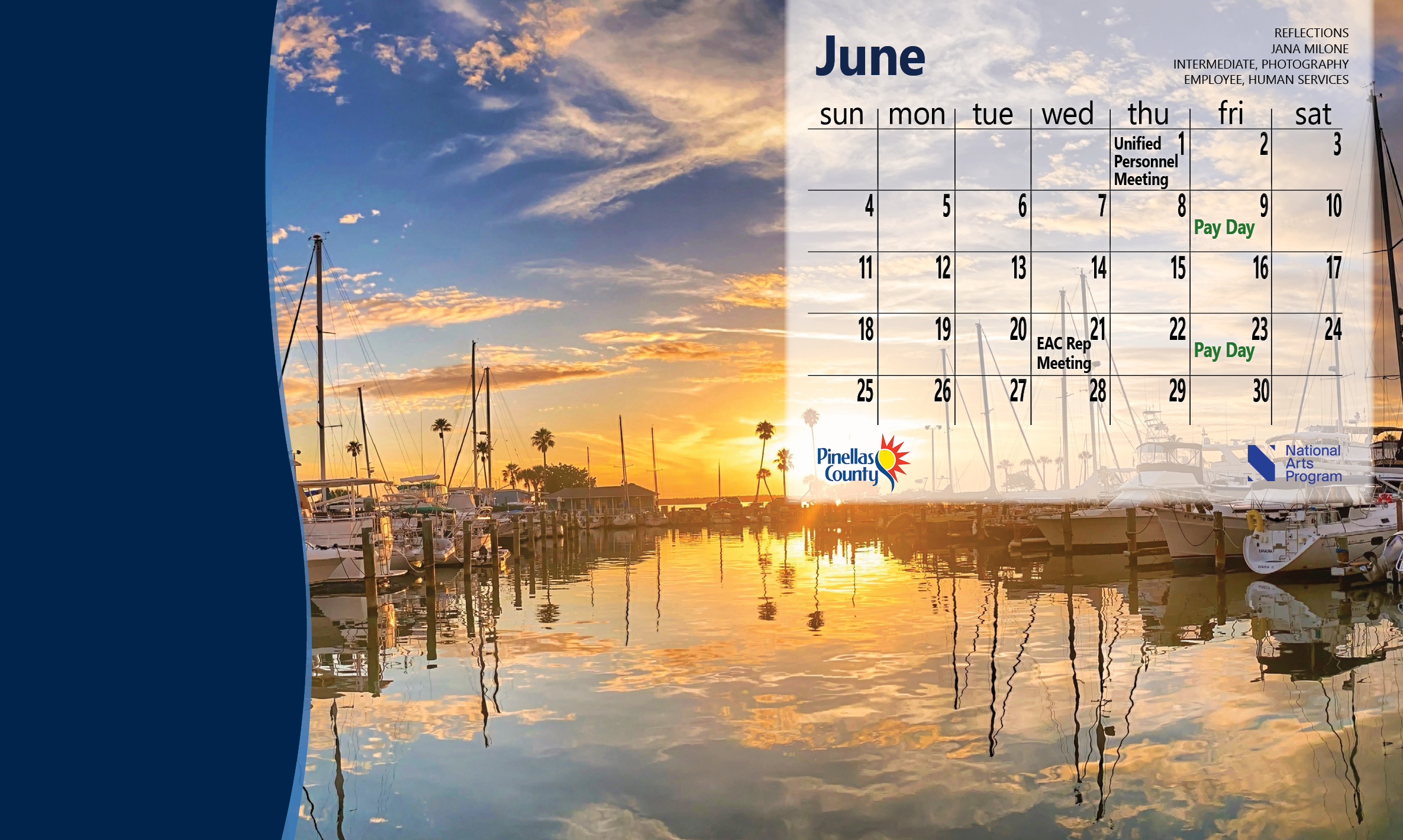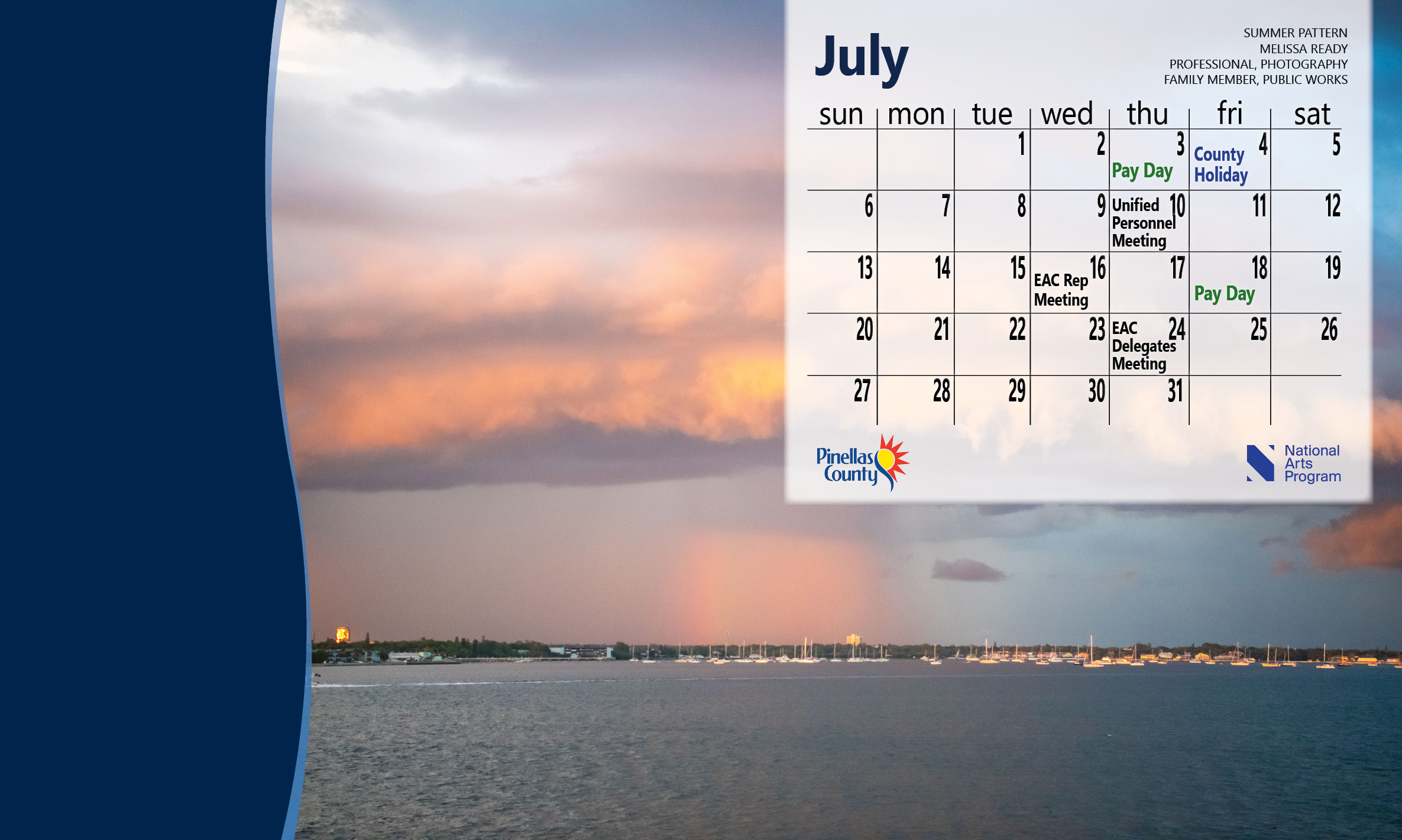 Every month, we post two wallpaper images that you can choose from to update your desktop wallpaper calendar. The images are entries in the annual Colors of Pinellas Art Show. The artist can be an employee, retiree, volunteer, intern or family member, and is noted in the top right of the calendar.