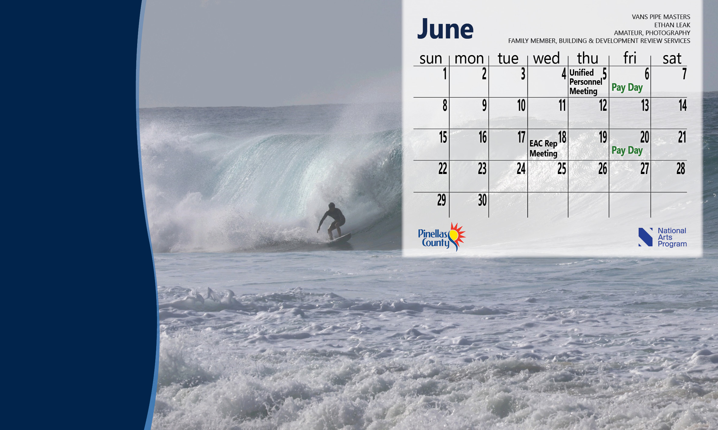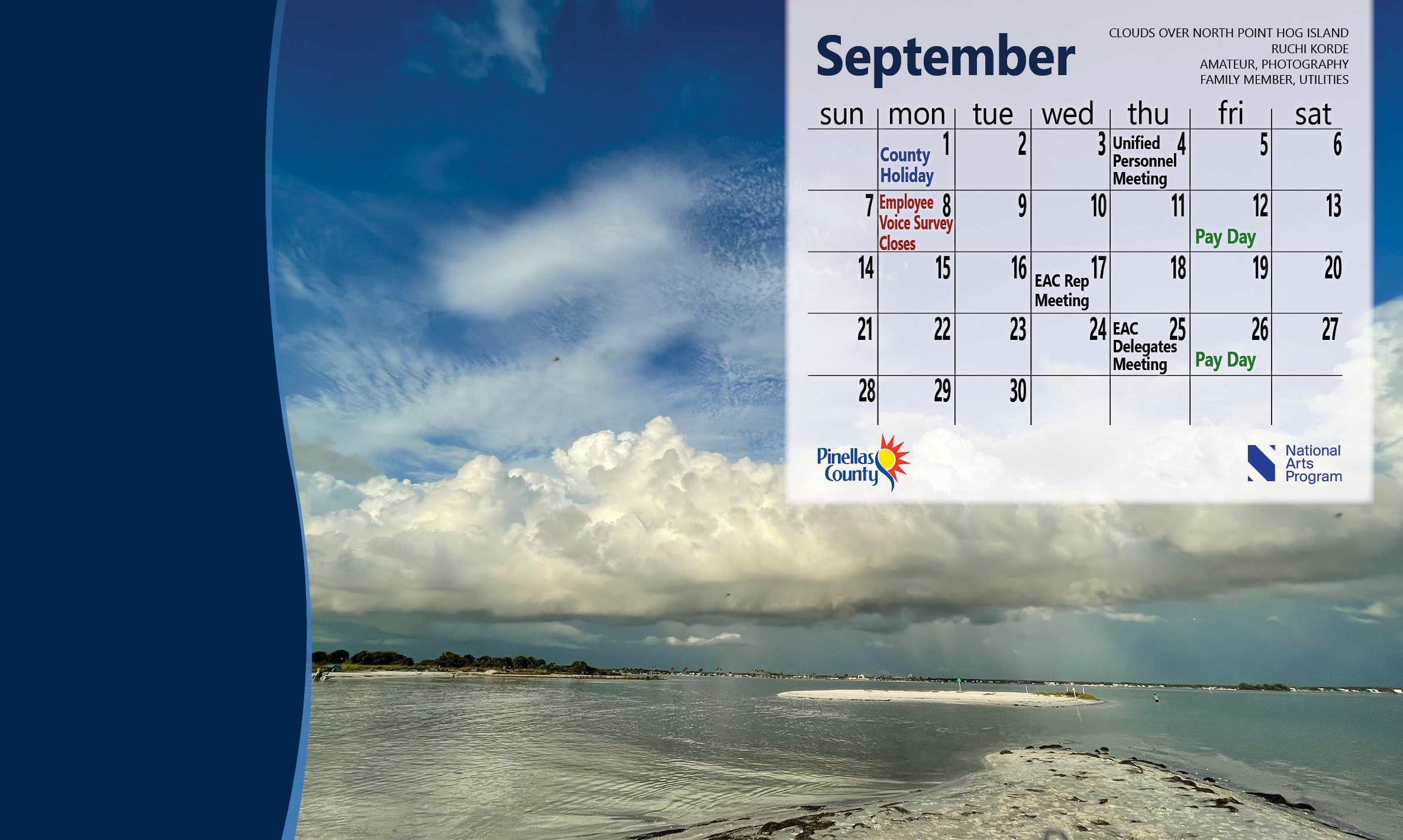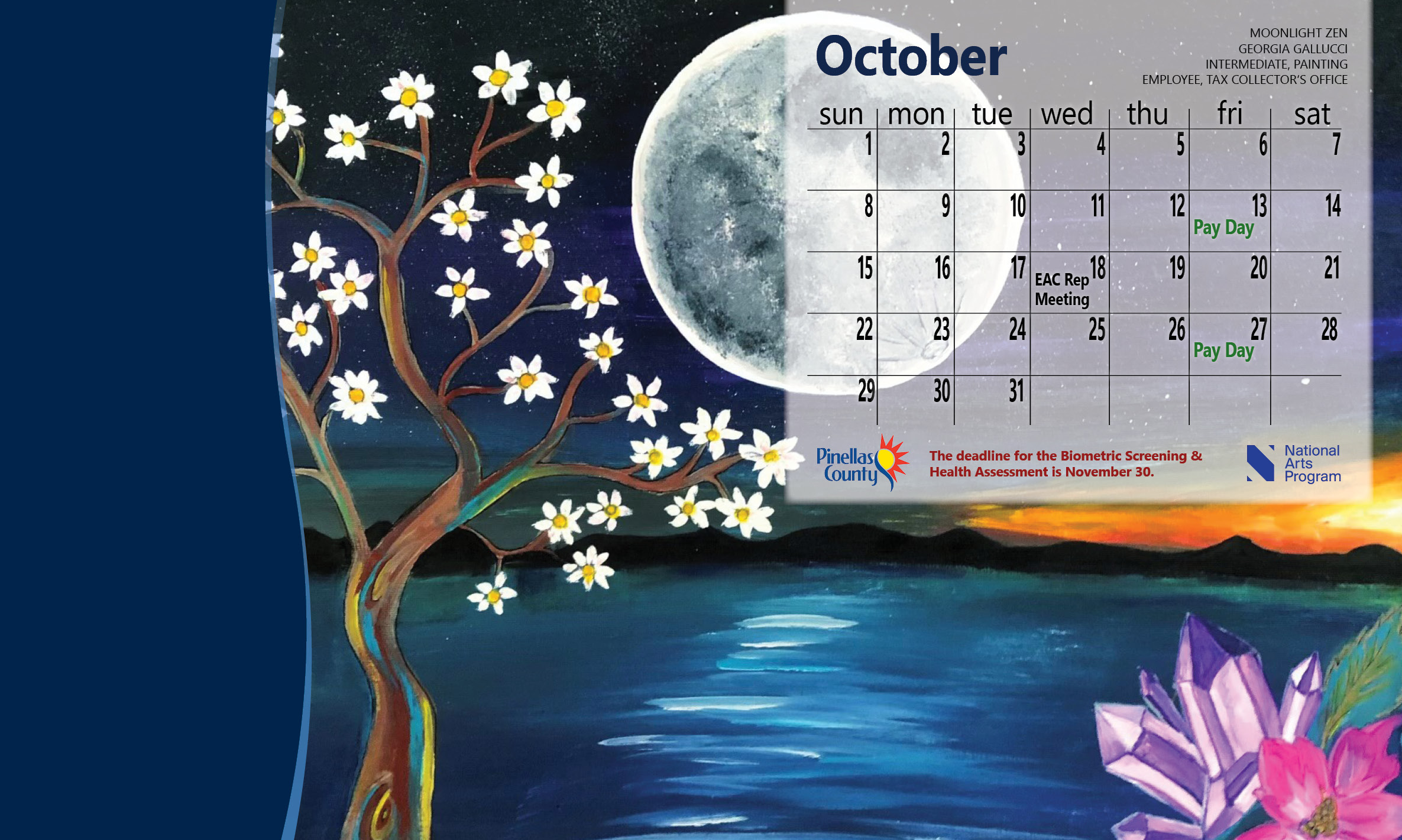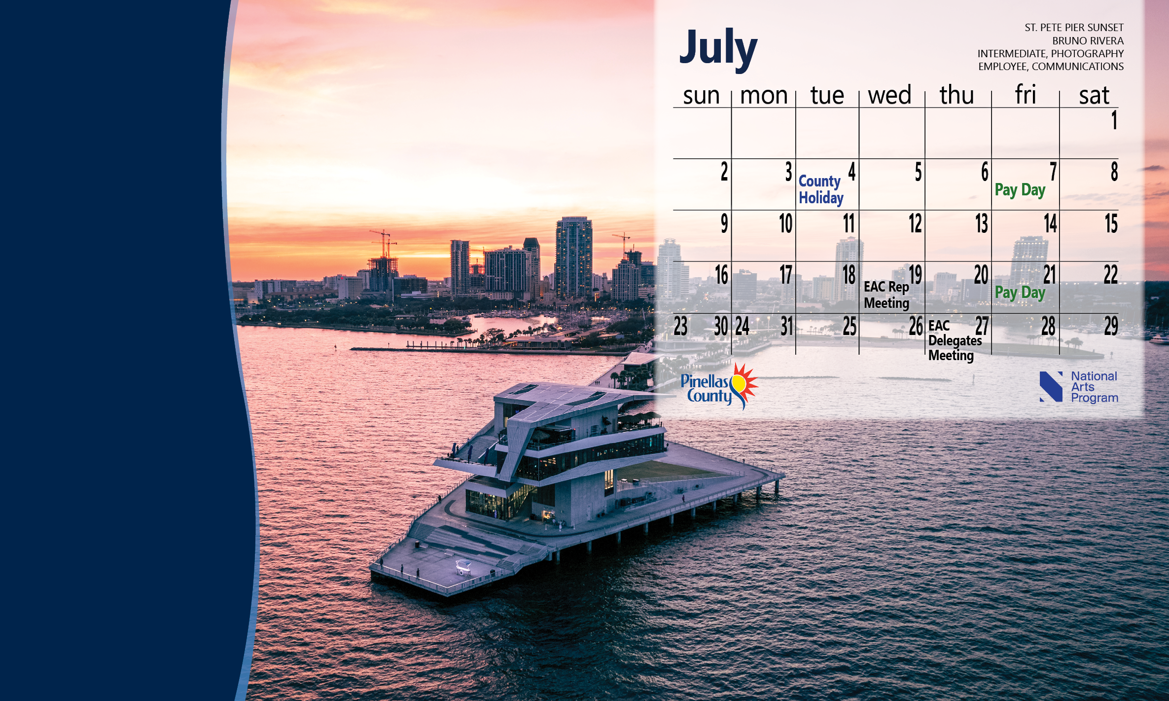 Every month, we post two wallpaper images that you can choose from to update your desktop wallpaper calendar. The images are entries in the annual Colors of Pinellas Art Show. The artist can be an employee, retiree, volunteer, intern or family member, and is noted in the top right of the calendar.
