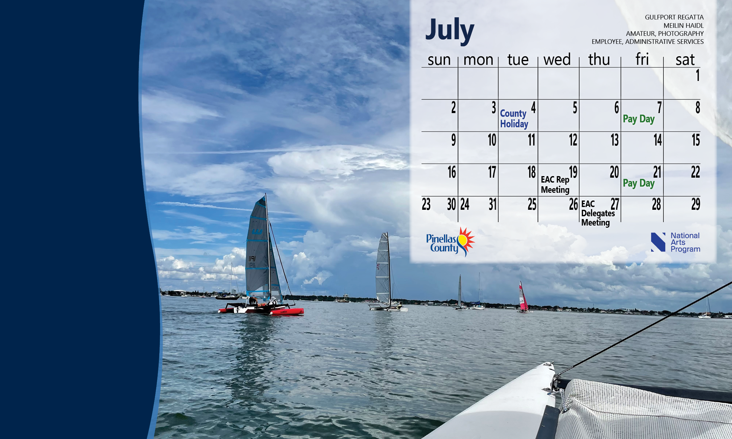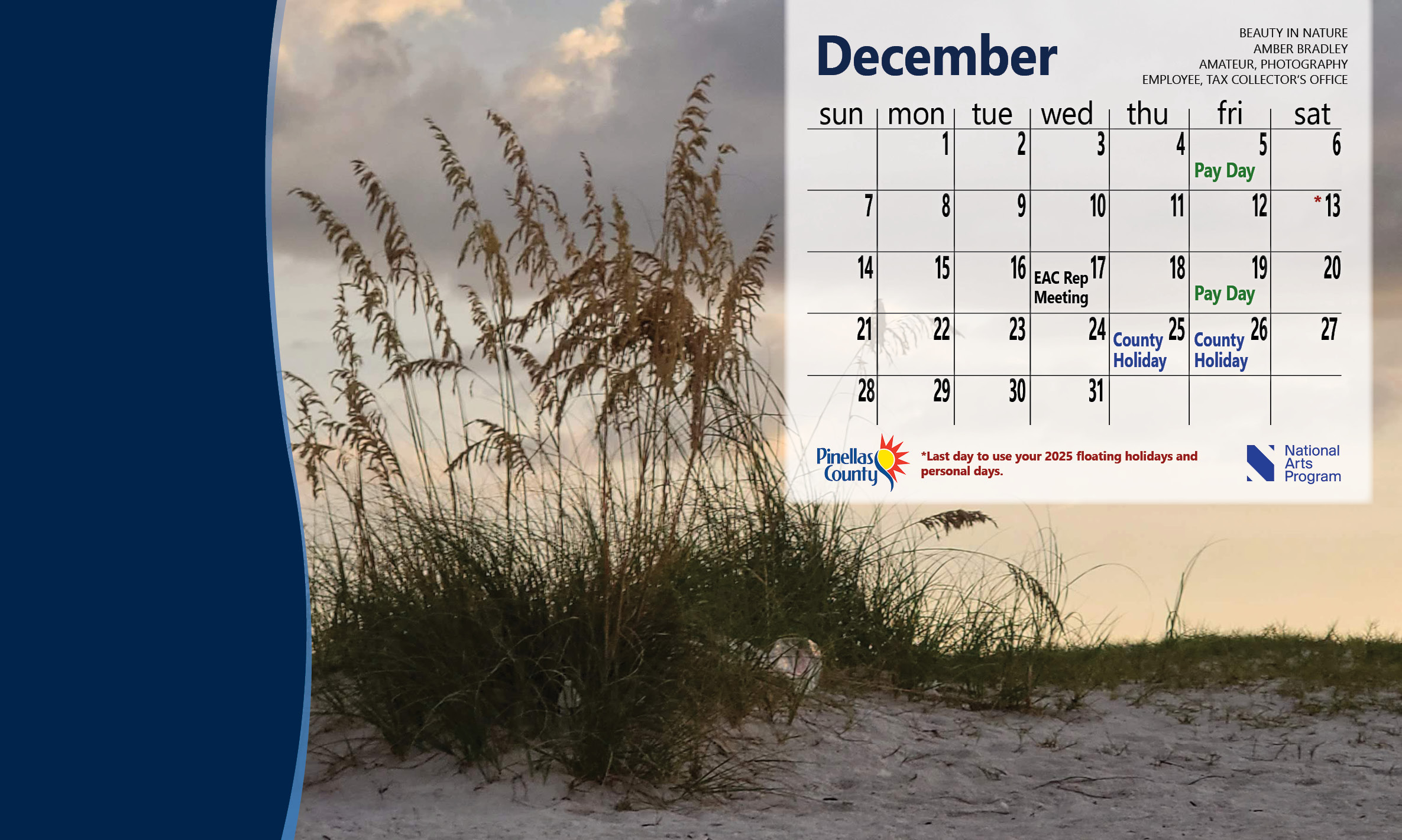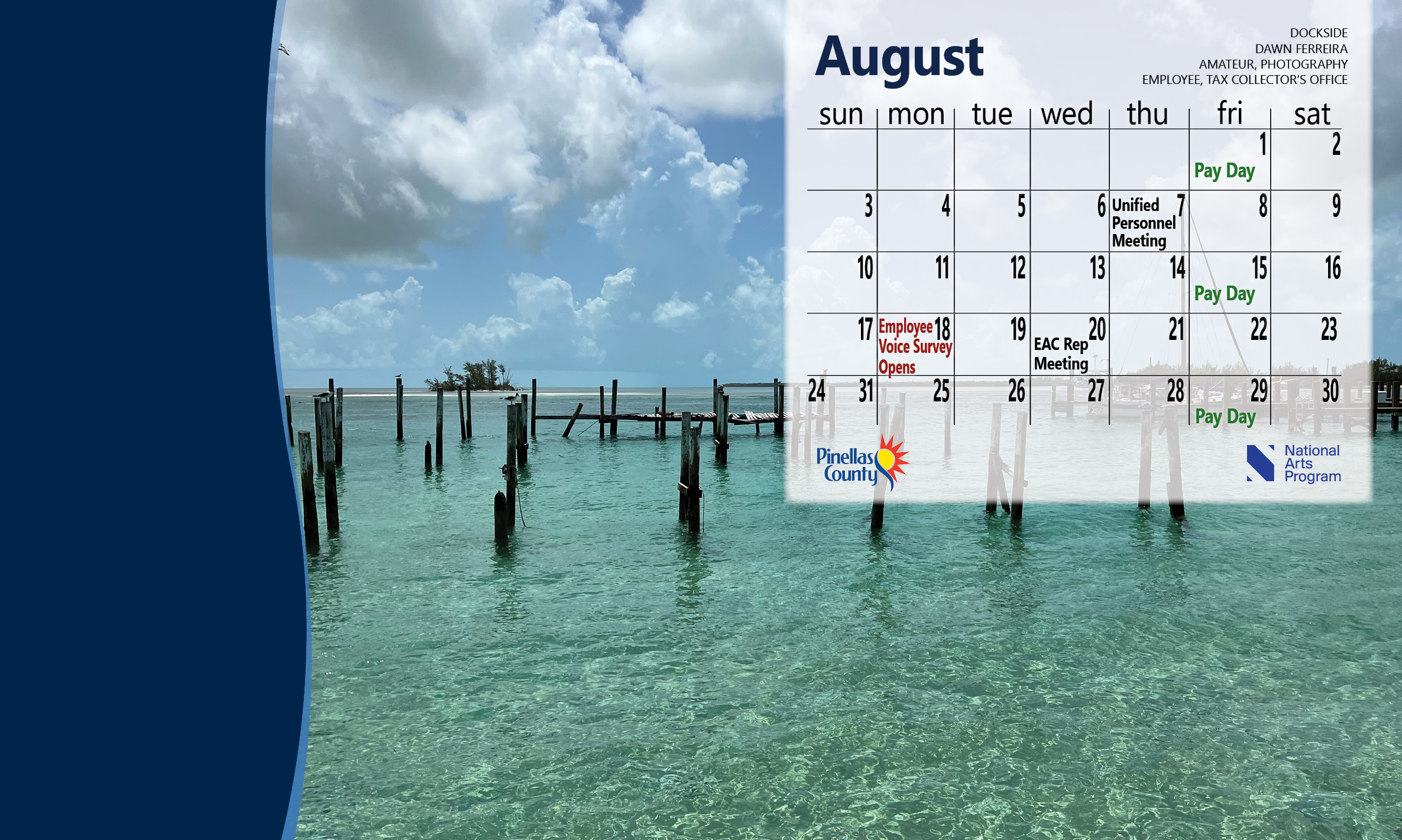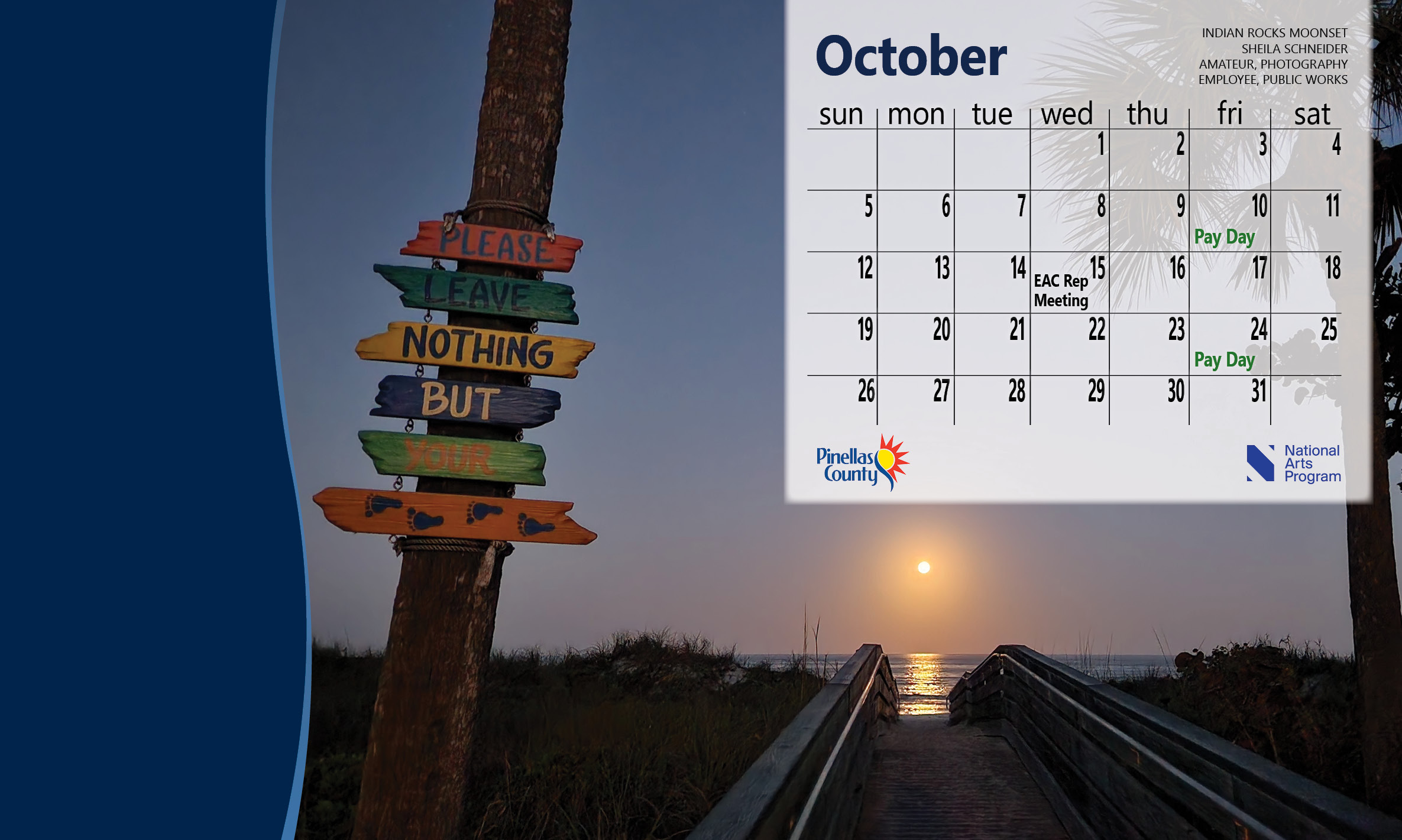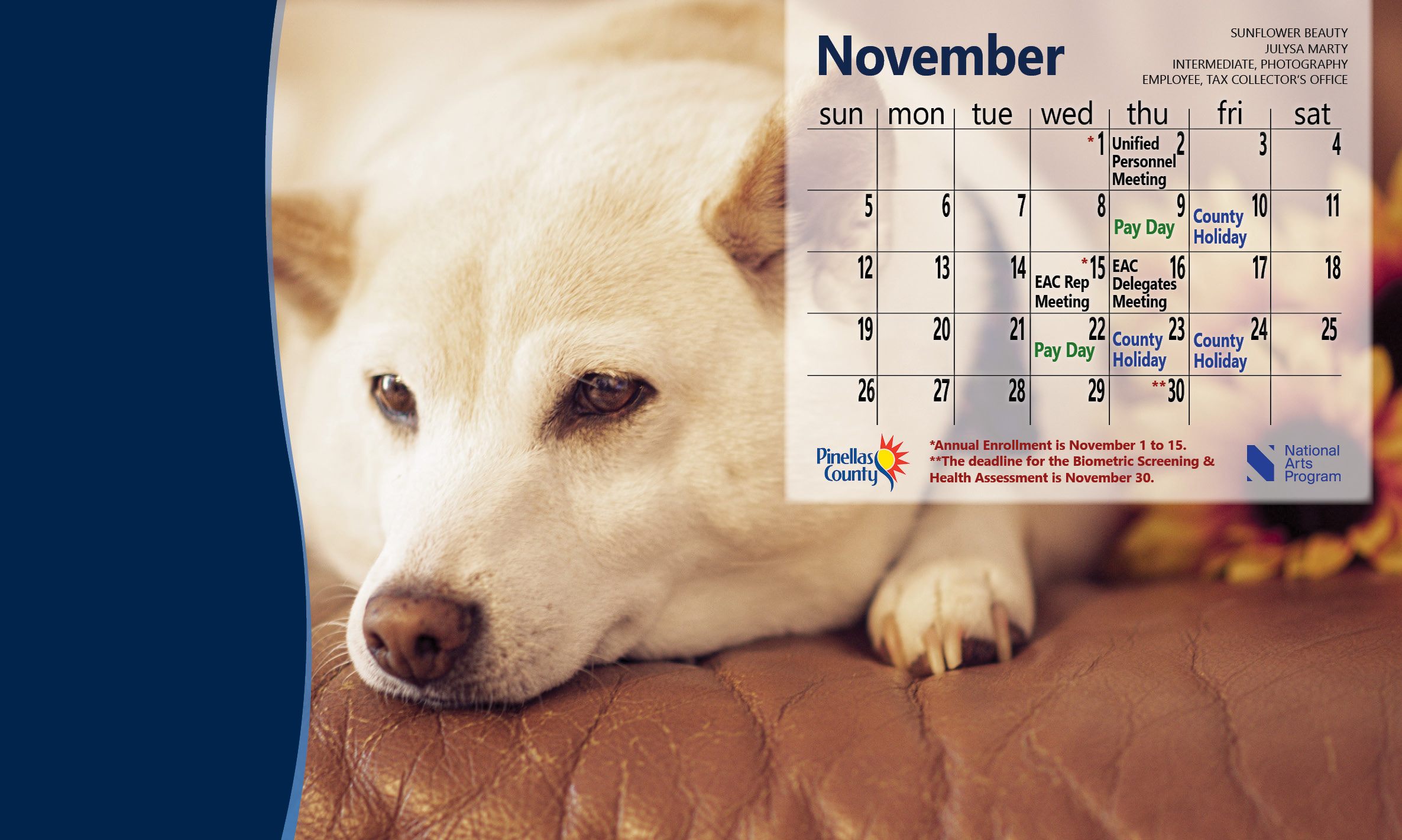 Every month, we post two wallpaper images that you can choose from to update your desktop wallpaper calendar. The images are entries in the annual Colors of Pinellas Art Show. The artist can be an employee, retiree, volunteer, intern or family member, and is noted in the top right of the calendar.