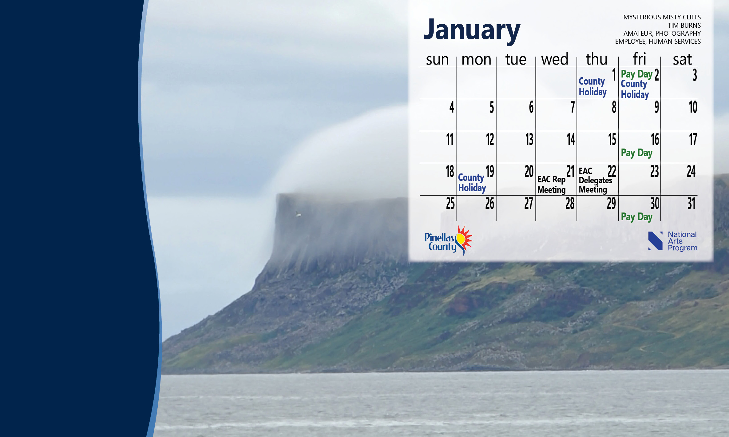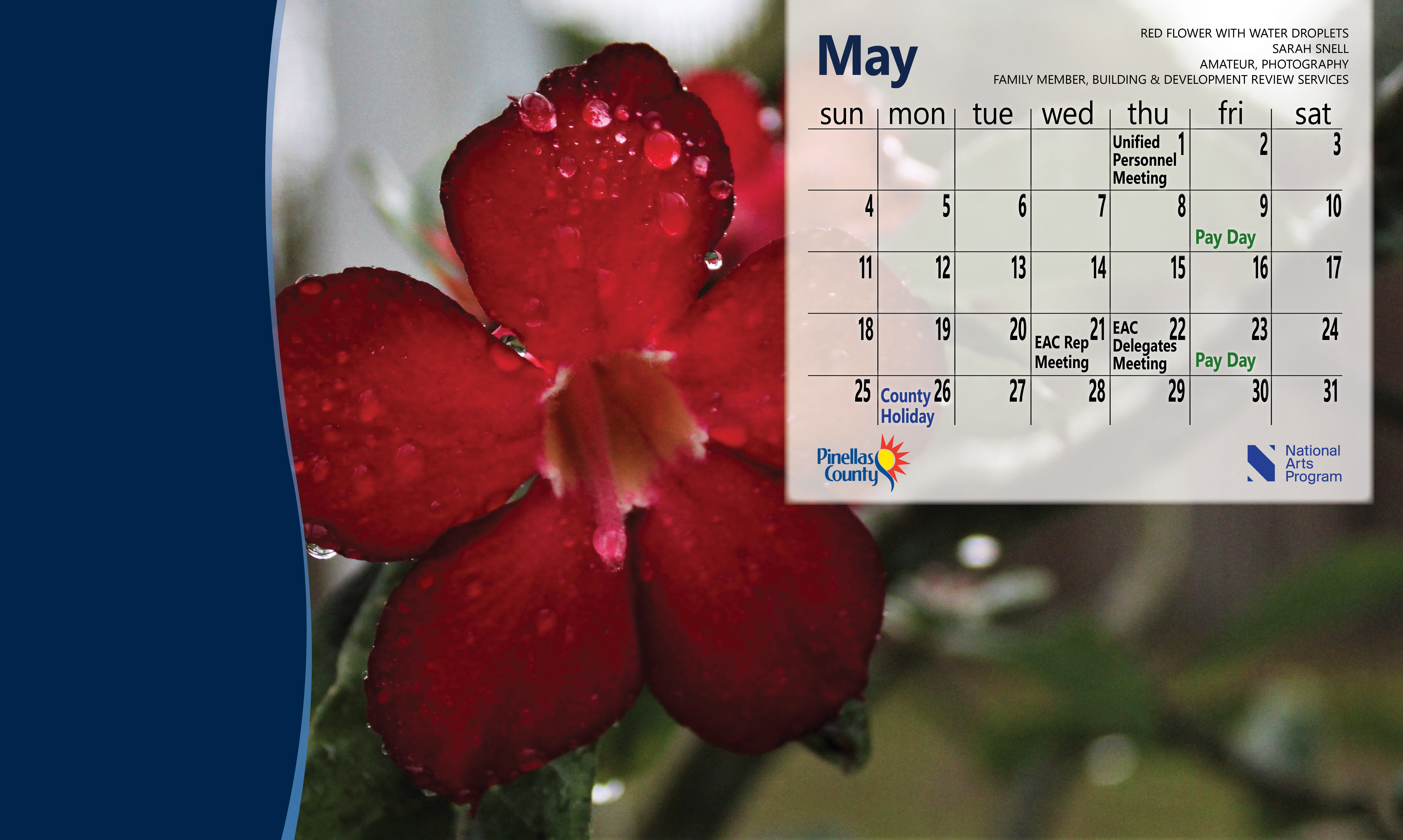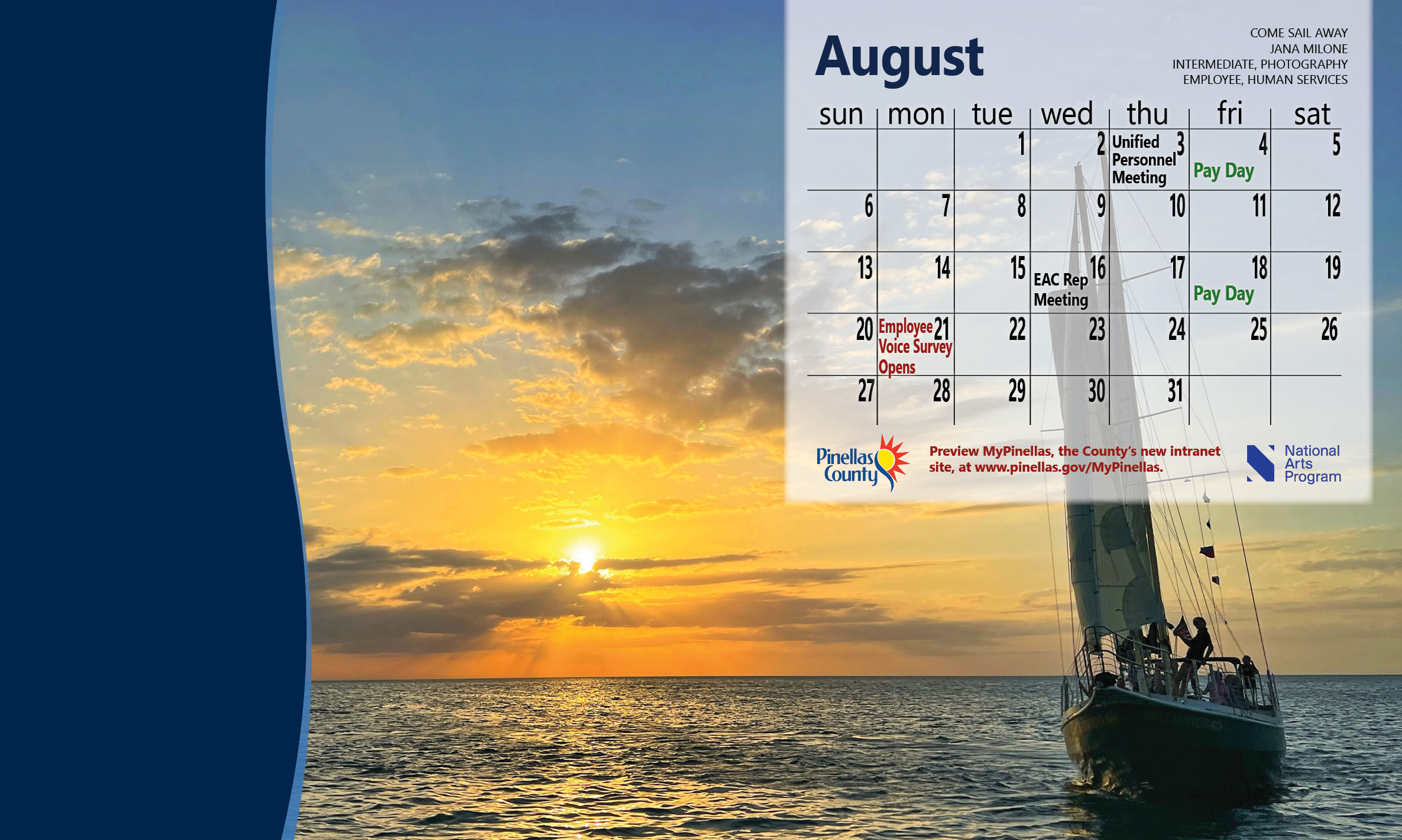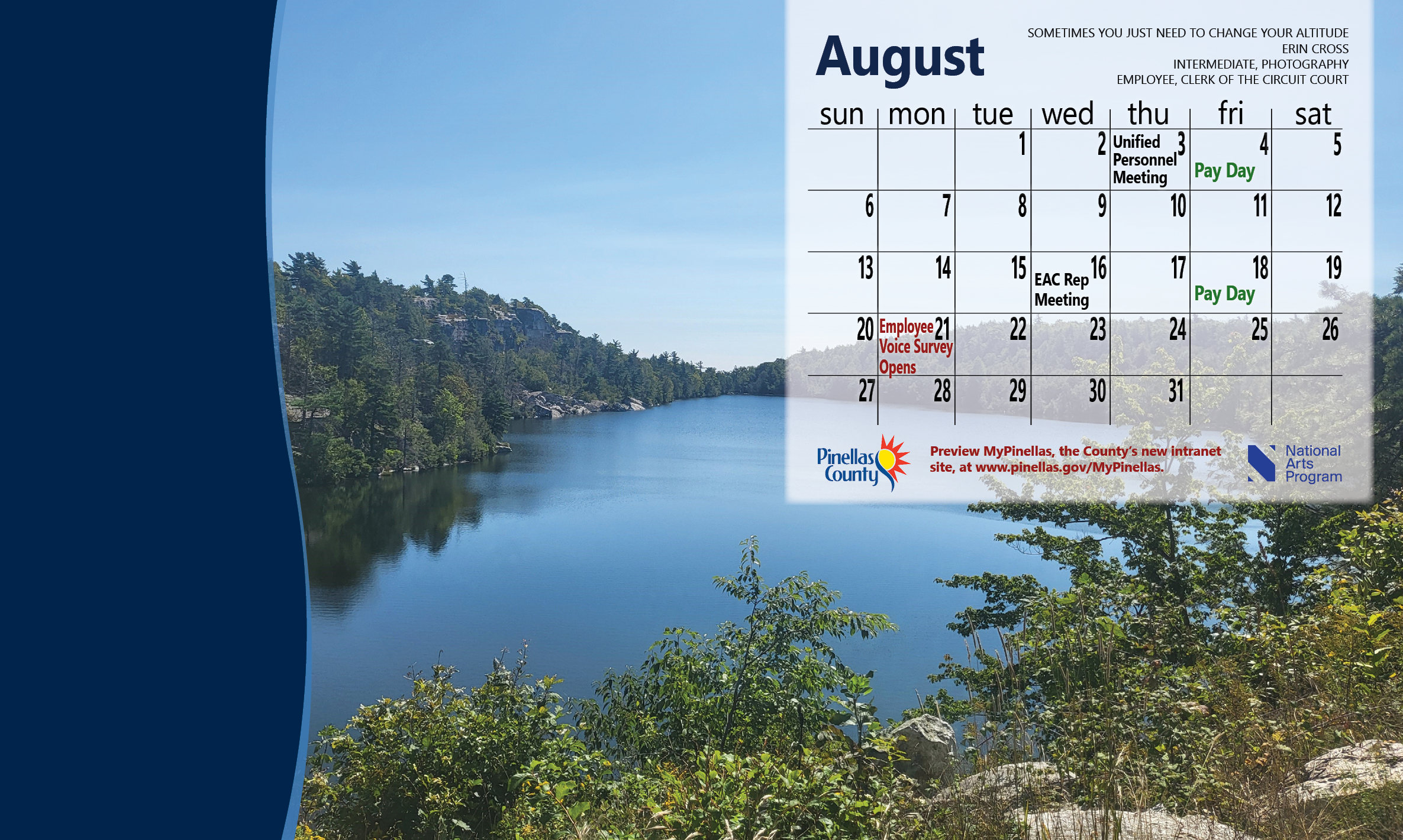 Every month, we post two wallpaper images that you can choose from to update your desktop wallpaper calendar. The images are entries in the annual Colors of Pinellas Art Show. The artist can be an employee, retiree, volunteer, intern or family member, and is noted in the top right of the calendar.