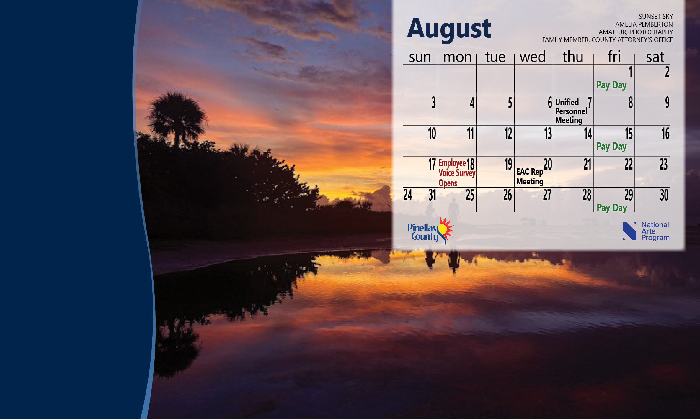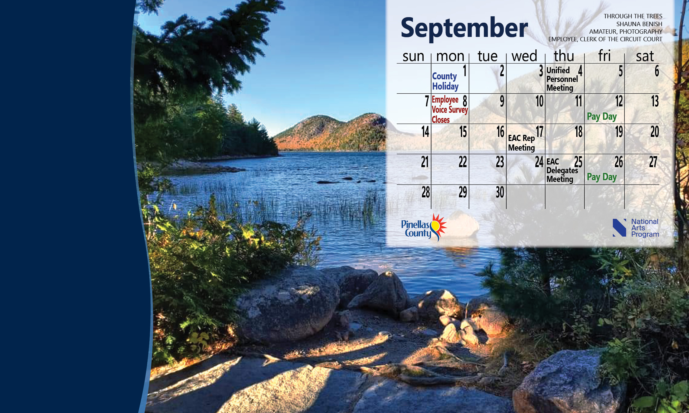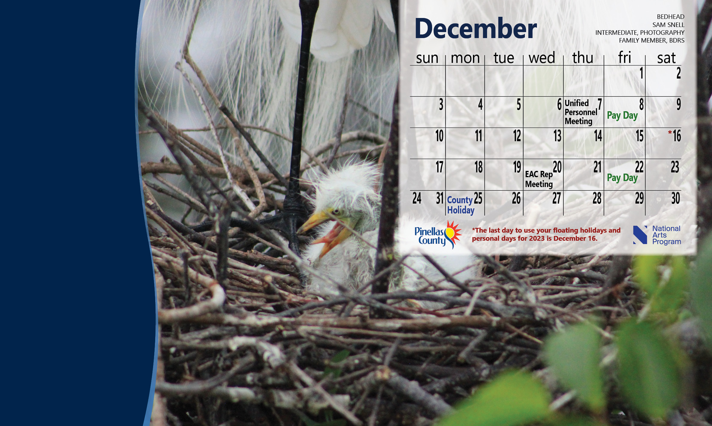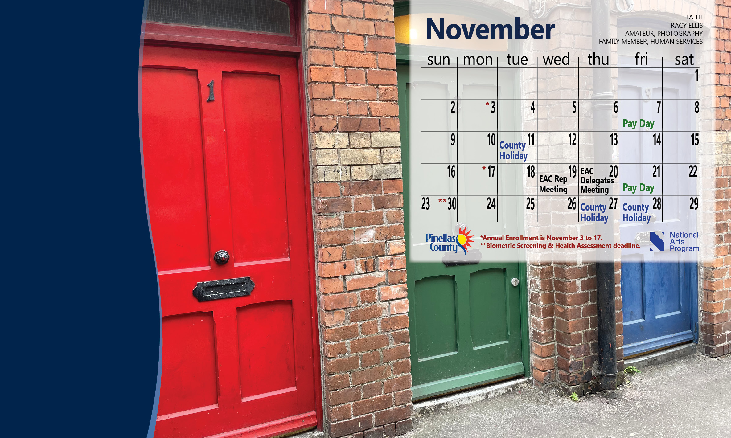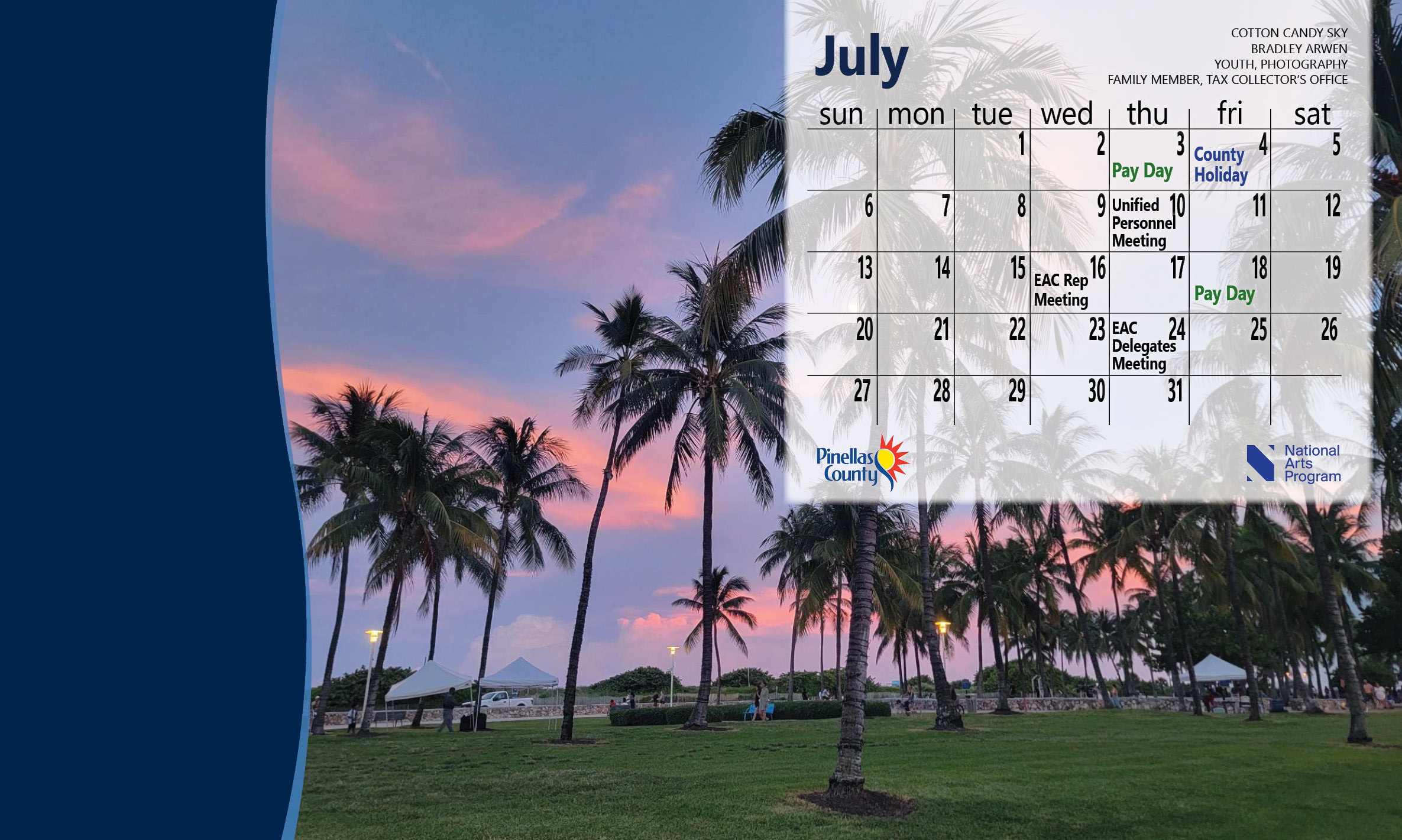 Every month, we post two wallpaper images that you can choose from to update your desktop wallpaper calendar. The images are entries in the annual Colors of Pinellas Art Show. The artist can be an employee, retiree, volunteer, intern or family member, and is noted in the top right of the calendar.