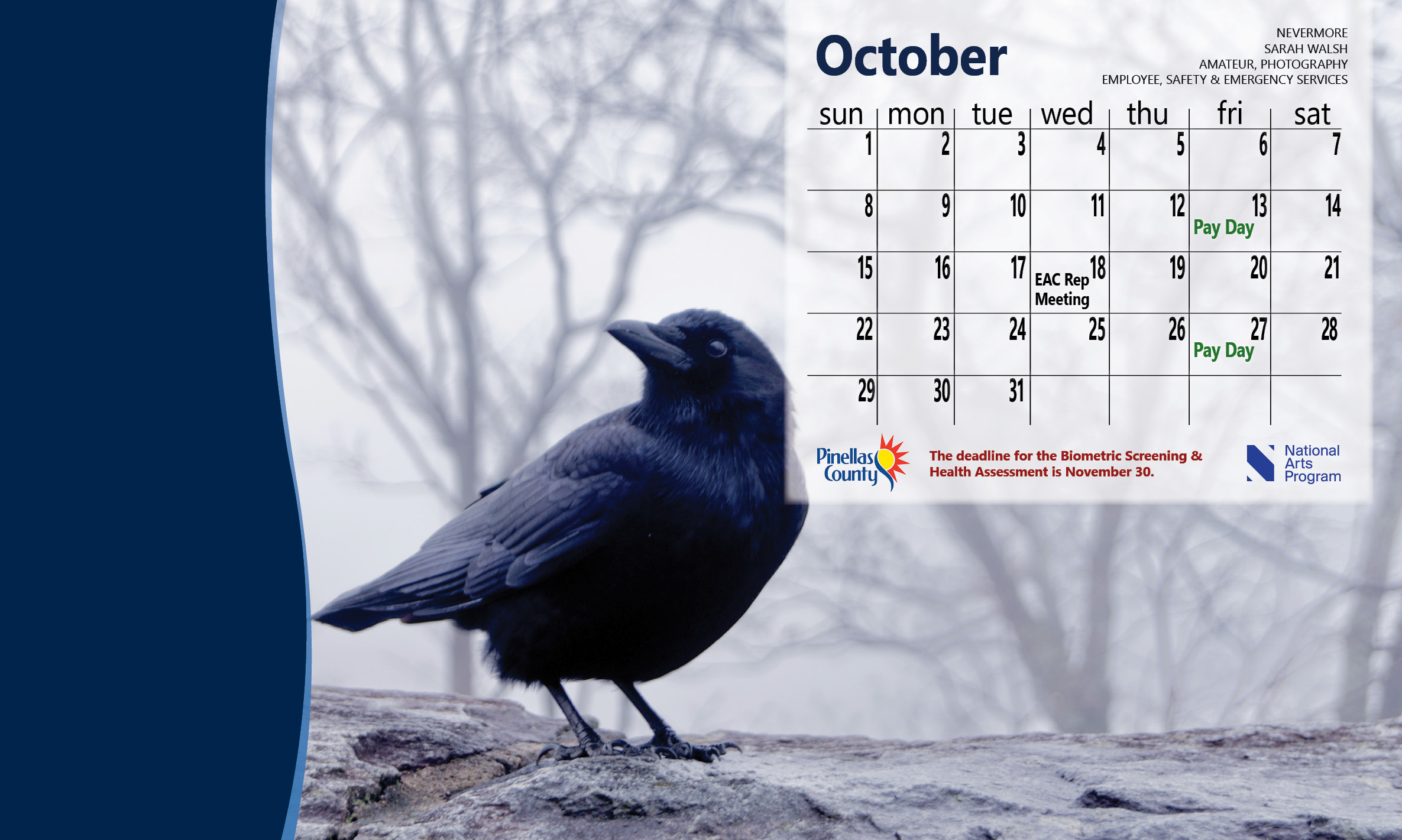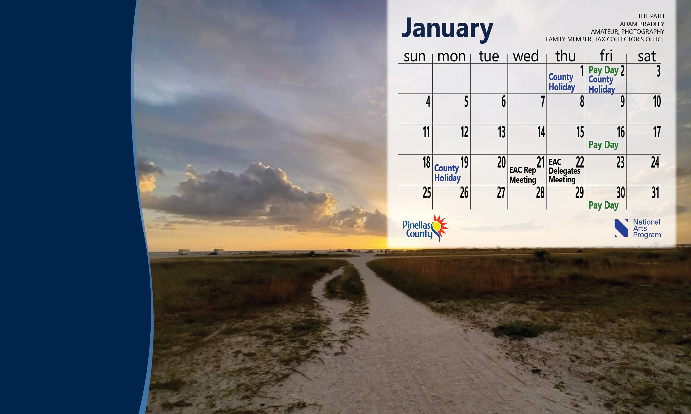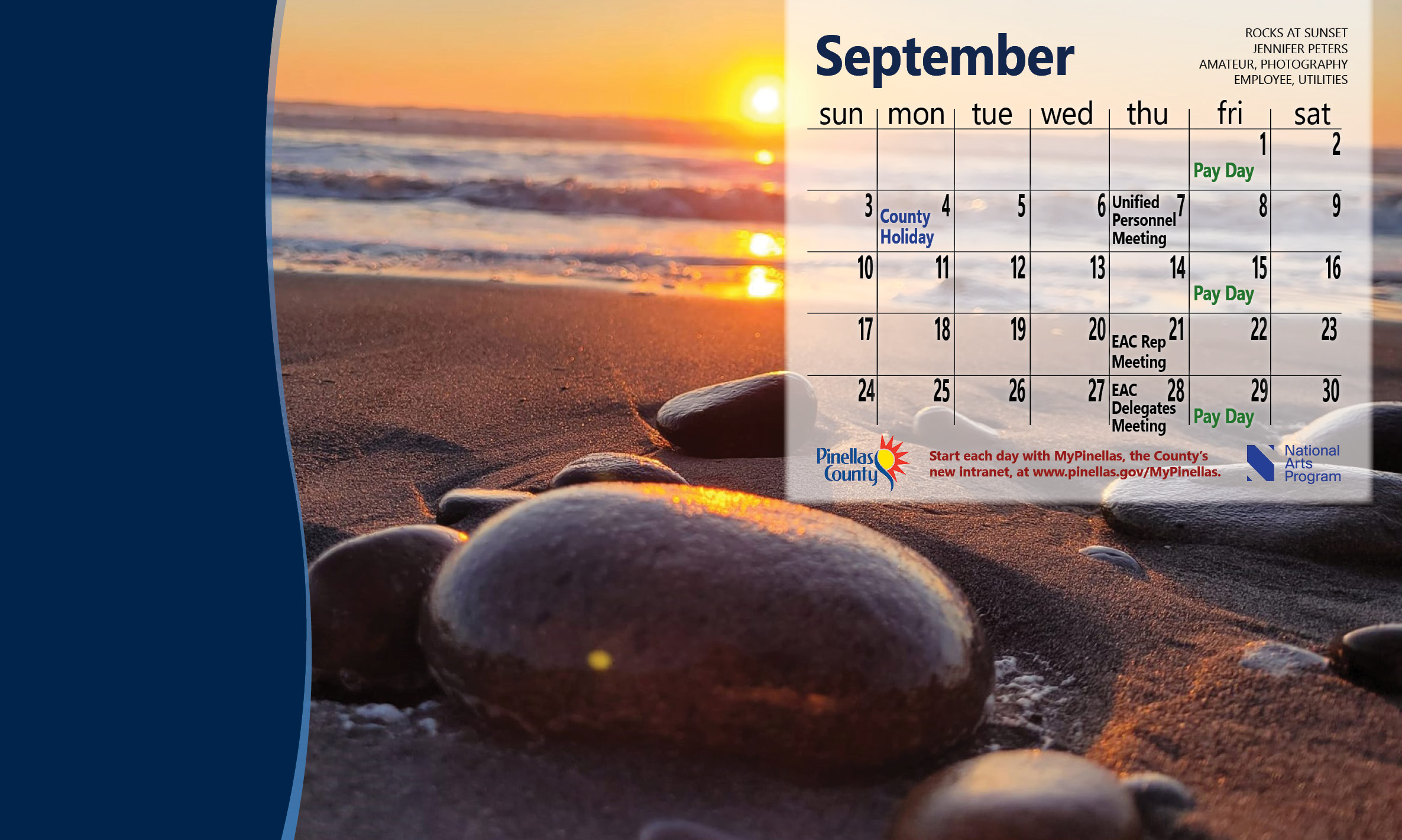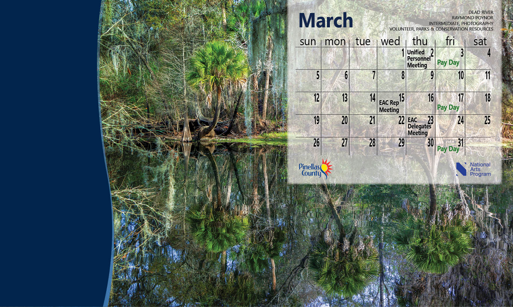 Every month, we post two wallpaper images that you can choose from to update your desktop wallpaper calendar. The images are entries in the annual Colors of Pinellas Art Show. The artist can be an employee, retiree, volunteer, intern or family member, and is noted in the top right of the calendar.
