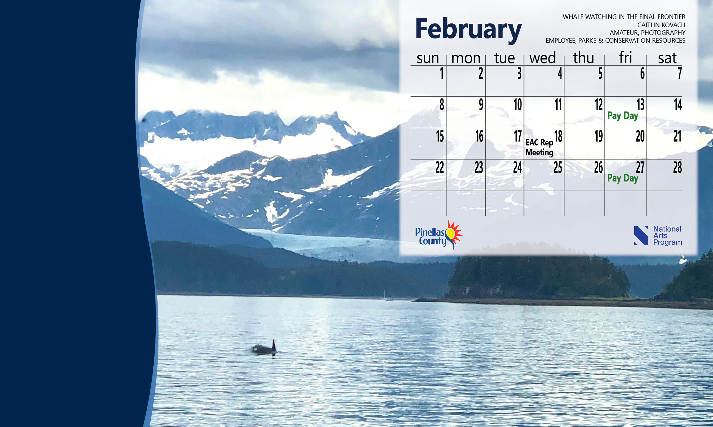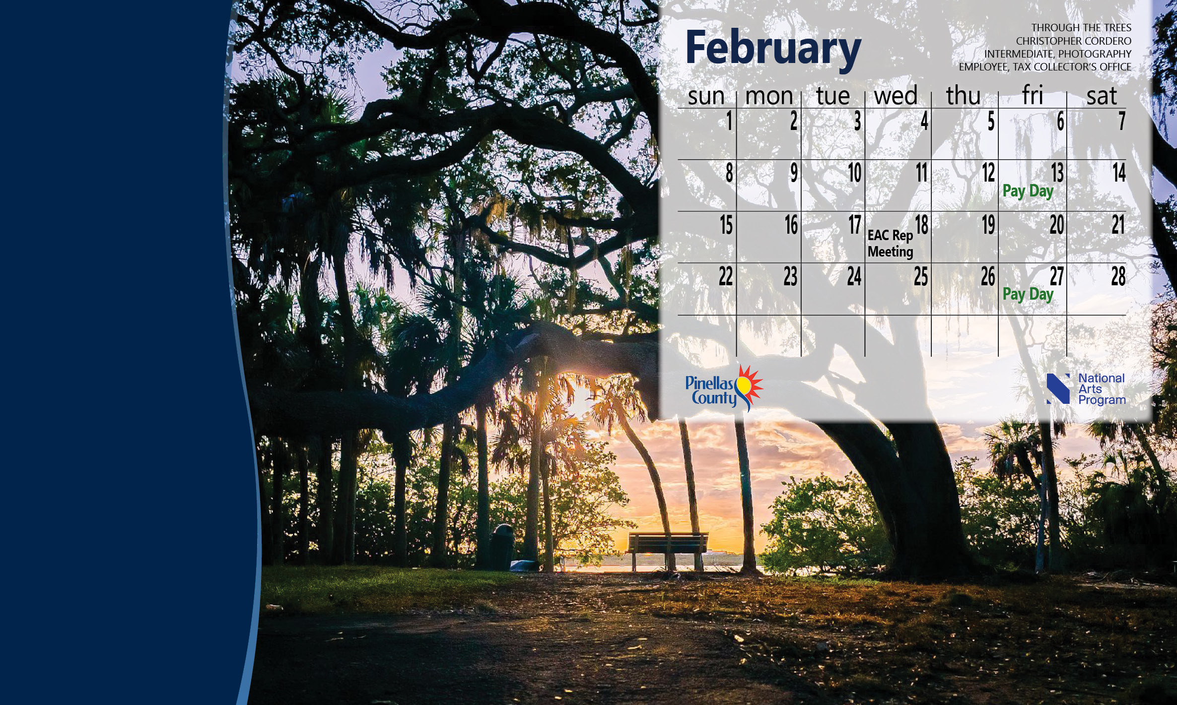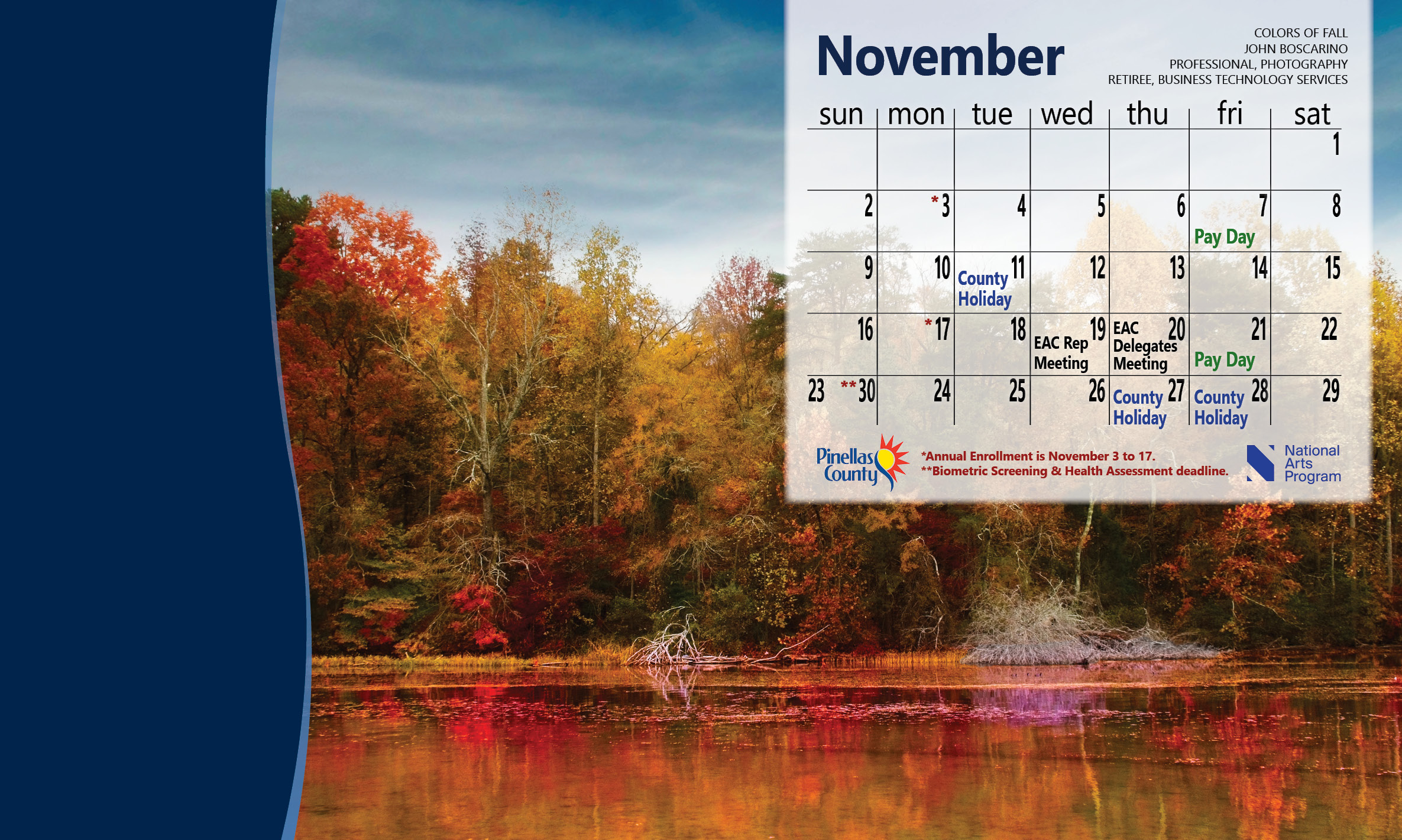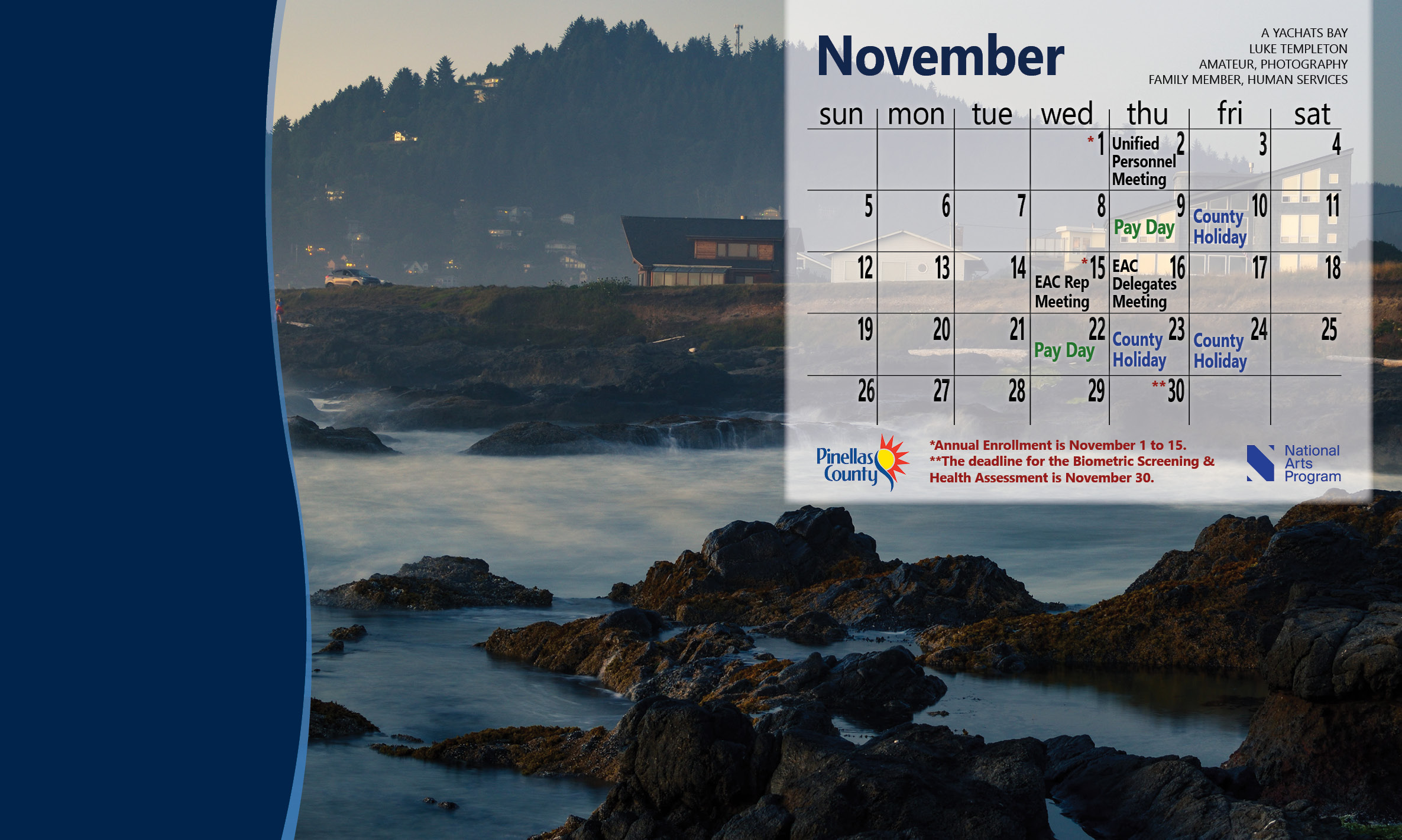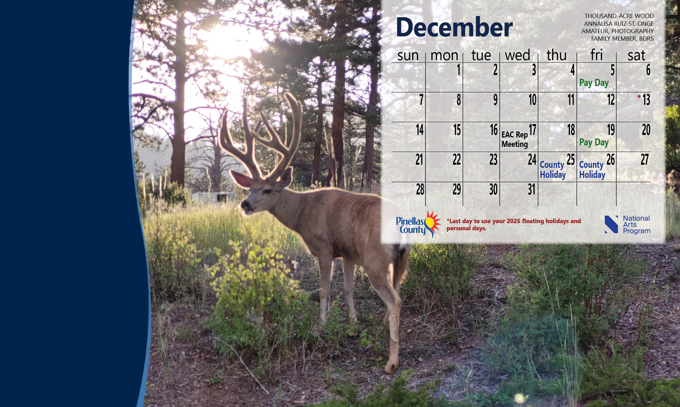 Every month, we post two wallpaper images that you can choose from to update your desktop wallpaper calendar. The images are entries in the annual Colors of Pinellas Art Show. The artist can be an employee, retiree, volunteer, intern or family member, and is noted in the top right of the calendar.