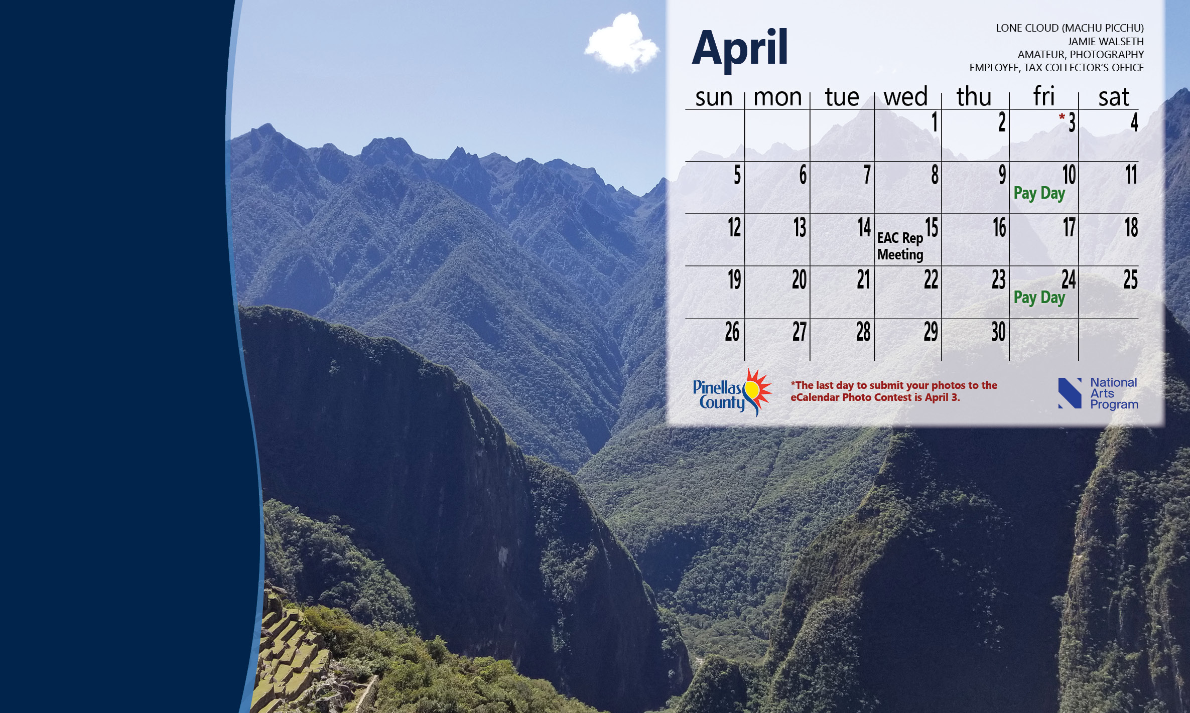 Every month, we post two images that you can choose from to update your desktop wallpaper calendar. The images are photos taken by an employee whose name is noted at the top right of the calendar. We request photo submissions during the eCalendar Photo Contest. Previously we used Colors of Pinellas Art Show entries submitted by employees, retirees, volunteers, and their family members.