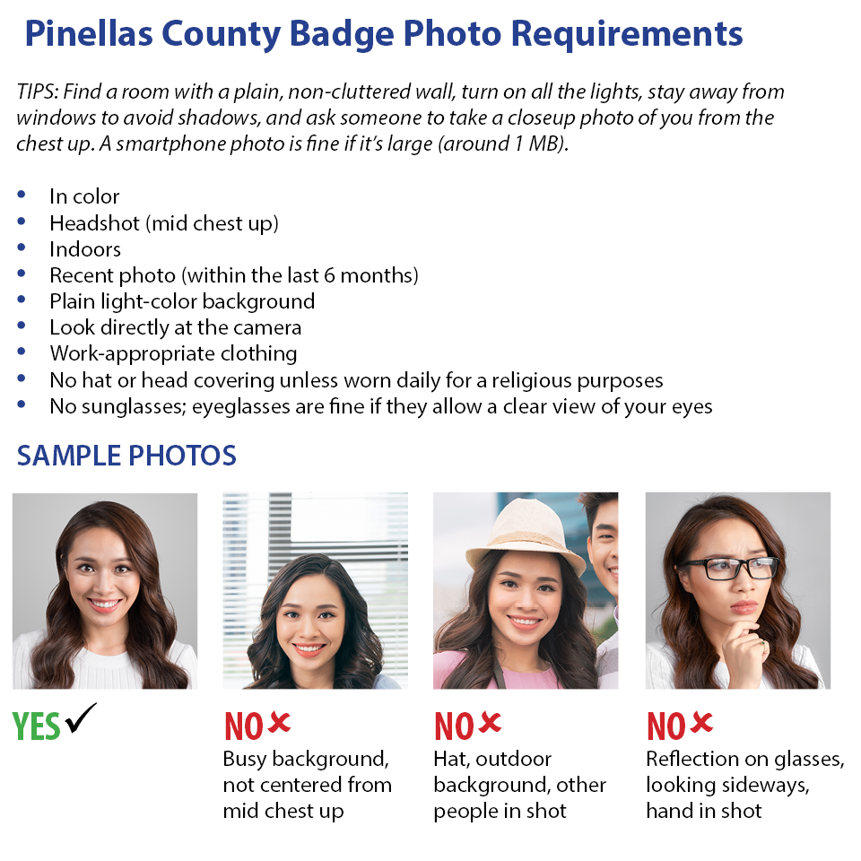 View a printable version of Pinellas County Badge Photo Requirements. See ID Badge Procedure.