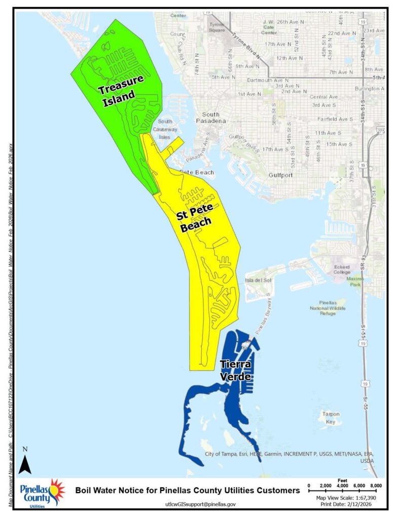 Pinellas County Utilities’ boil water notice for Treasure Island, St. Pete Beach and Tierra Verde is still in effect as of Friday afternoon, Feb. 13. See map for impacted areas.