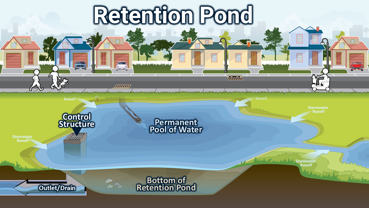 Retention systems (wet ponds) are some of the most recognizable components of a stormwater system. A wet pond is designed to function more like a natural waterbody and holds water most of the time. This permanent pool is below the level of a manmade drain structure.