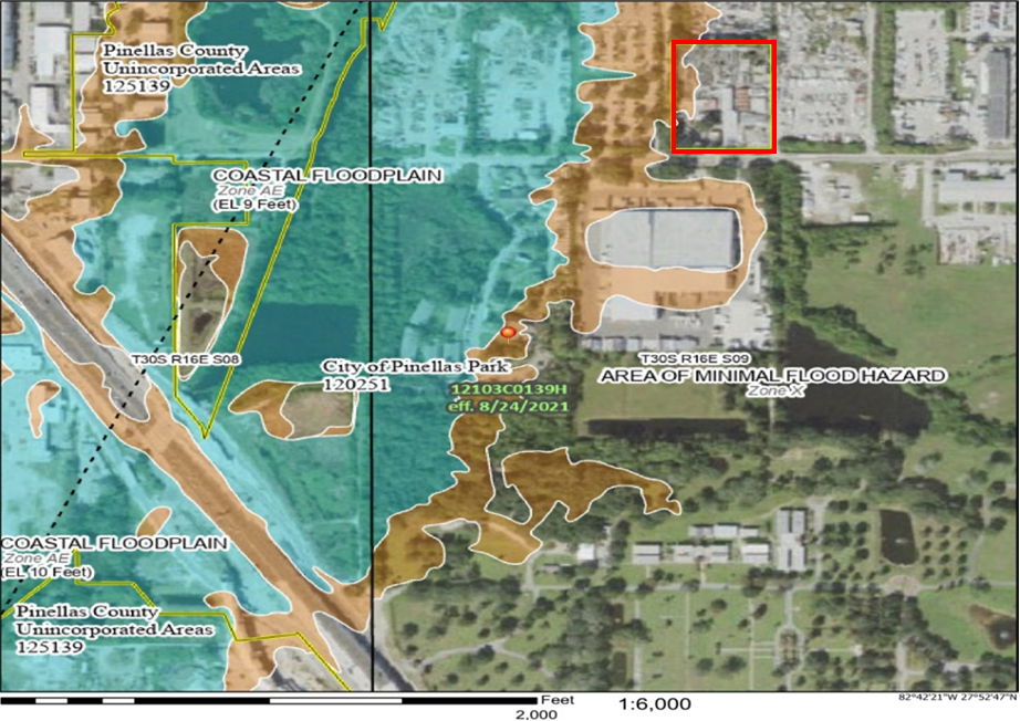 Per the effective Flood insurance Rate Map (FIRM) Panel Number 12103C0139H dated 8/24/2021 (see below), the project boundary to include remove and the removal and replacement of five residential buildings which provide housing to formerly homeless individuals; as well as the purchase and installation of a 60W generator. The map shows the entire site is in the 100-year floodplain (blue shaded Zone AE).